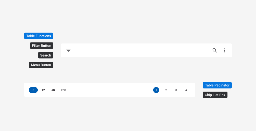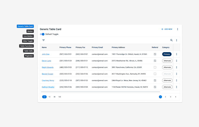 Button + Icon Button + Slide Toggle + Table Functions + Table Cells + Paginator → Generic Table Card